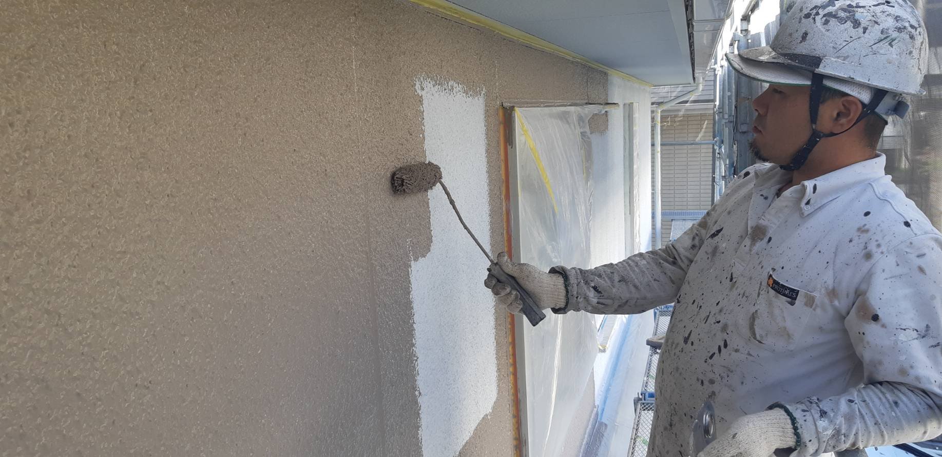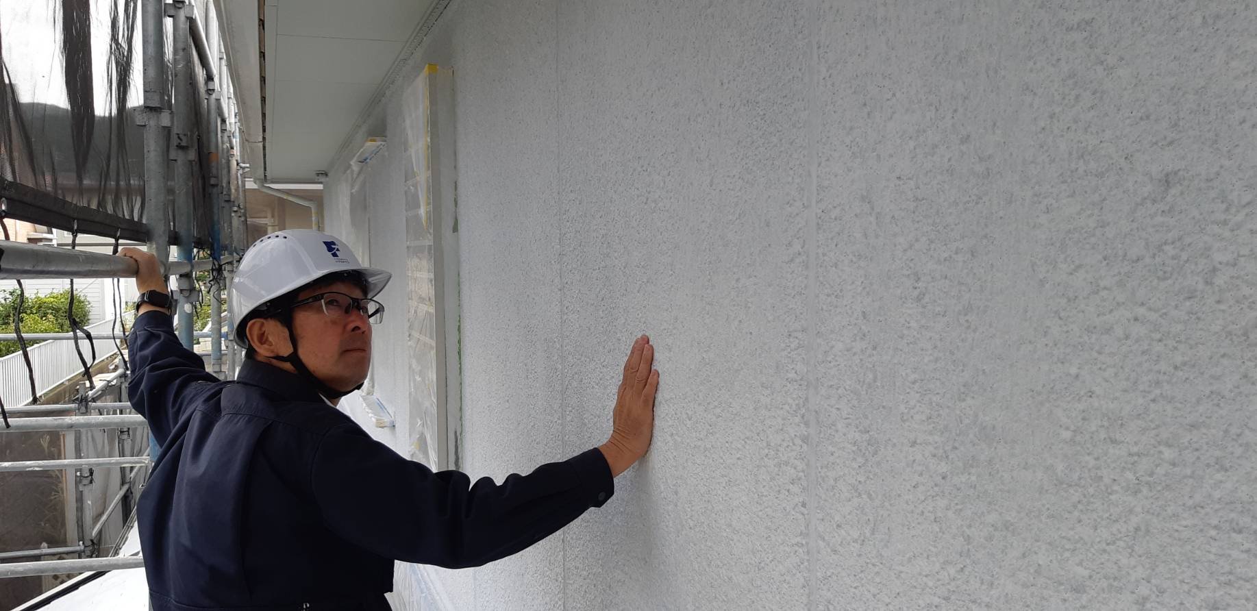 福岡県自由ヶ丘南H様邸施工4日目中間検査屋根縁切り中塗り外壁中塗り作業