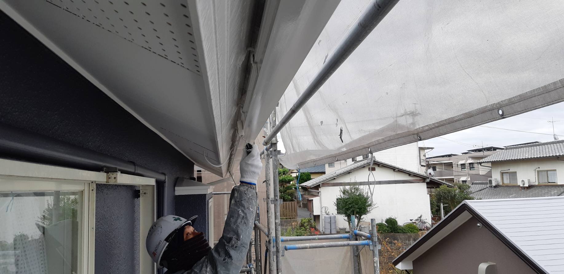 福岡県宗像市三郎丸S 様邸施工5日目外壁クリアー付帯塗装作業