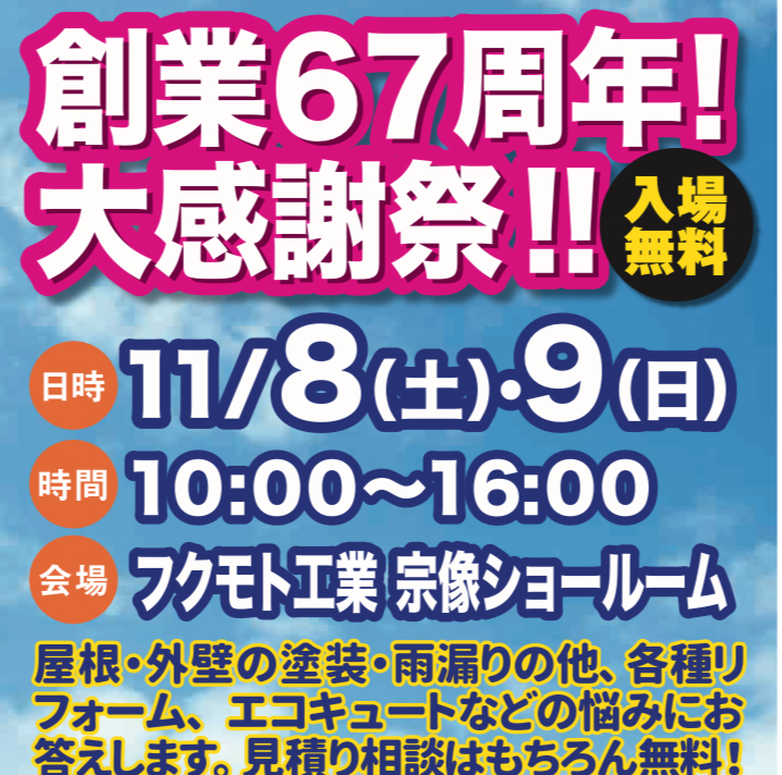 宗像市福津市古賀市中心に塗装工事、リフォーム工事、エコキュート工事を行なっております、株式会社フクモト工業です。