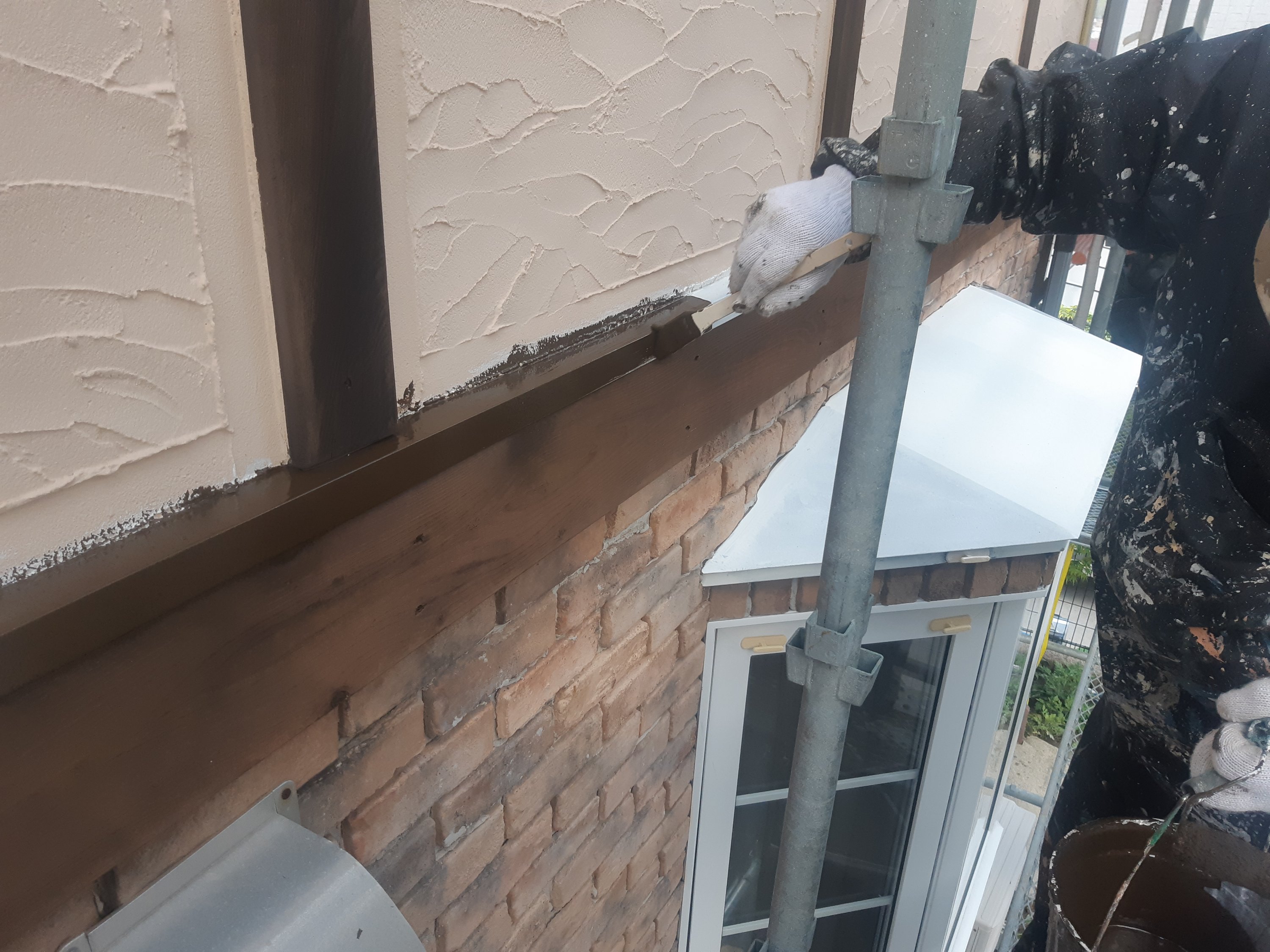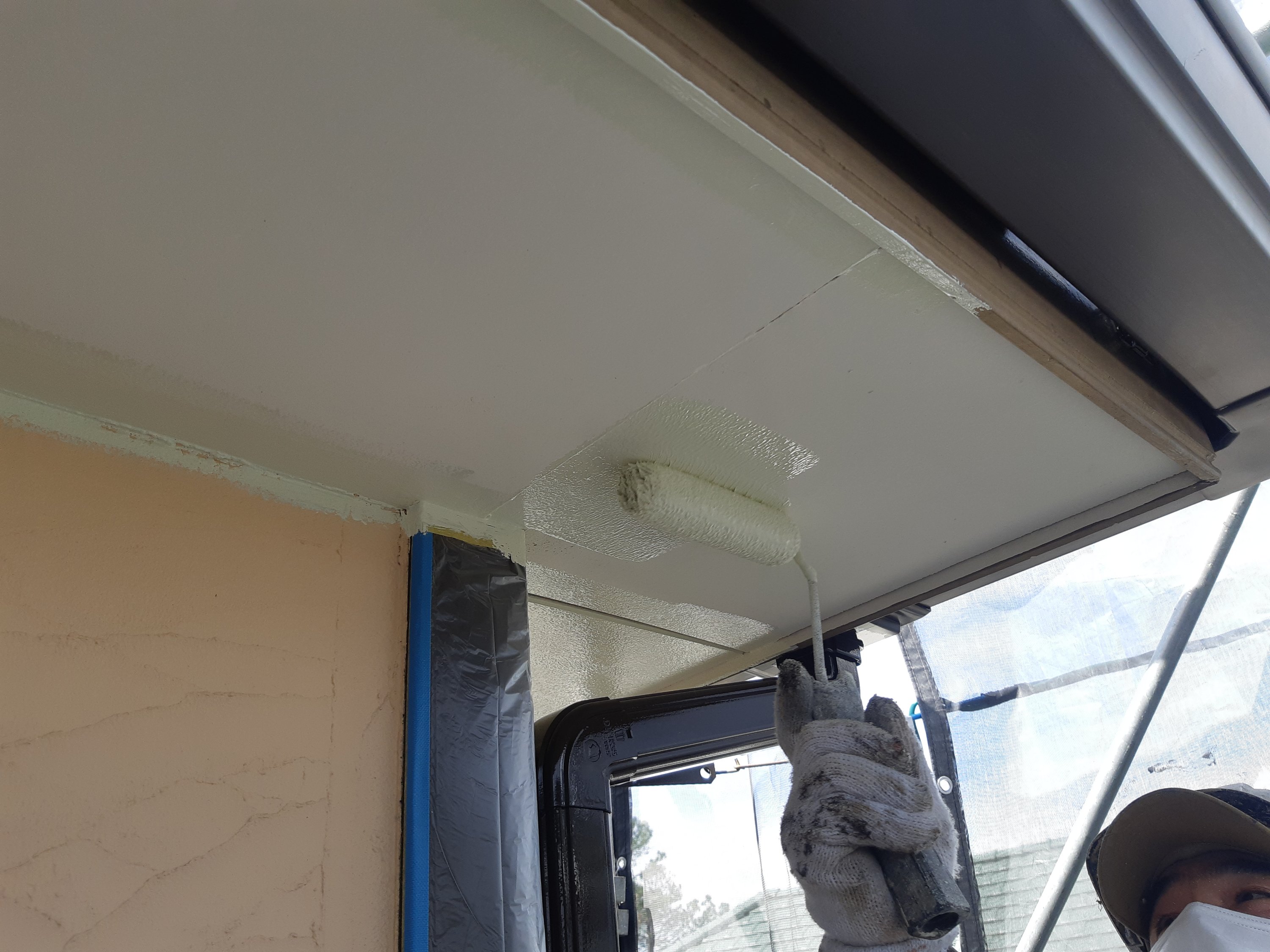 明日は、養生・付帯中塗り・軒天塗装を予定しています。