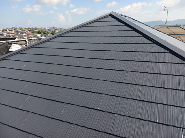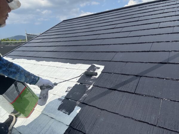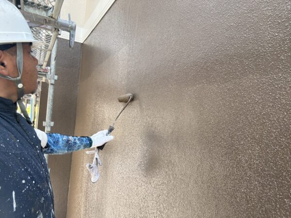 本日は、昨日雨で中断していた外壁下塗り作業の続きを行いました。