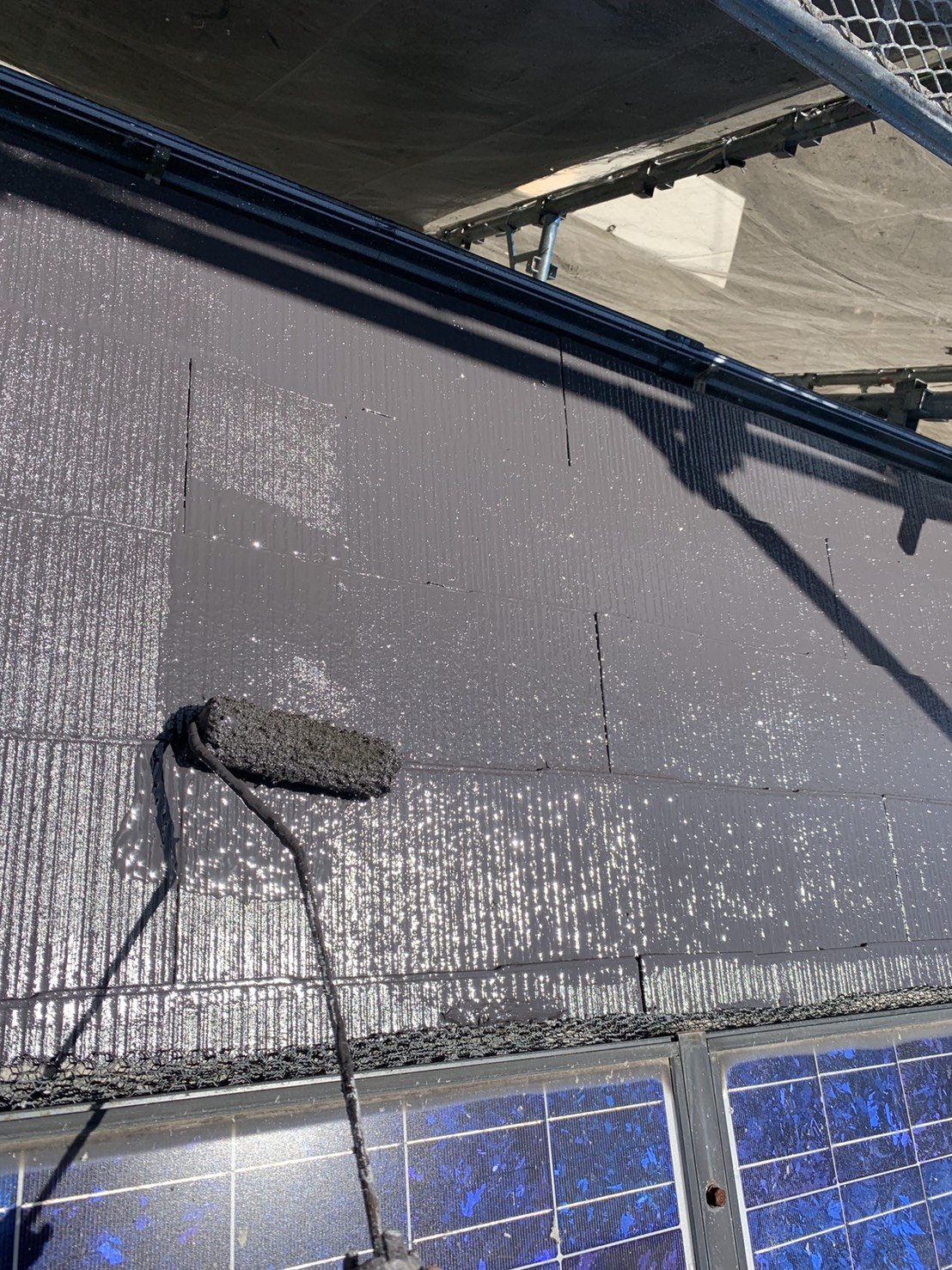 福岡県宗像市公園通りI様邸施工5日目外壁上塗り屋根上塗り作業
