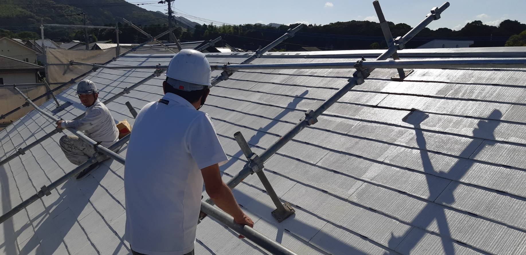 福岡県宗像市公園通りI様邸施工4日目中間検査屋根縁切り中塗り外壁中塗り作業
