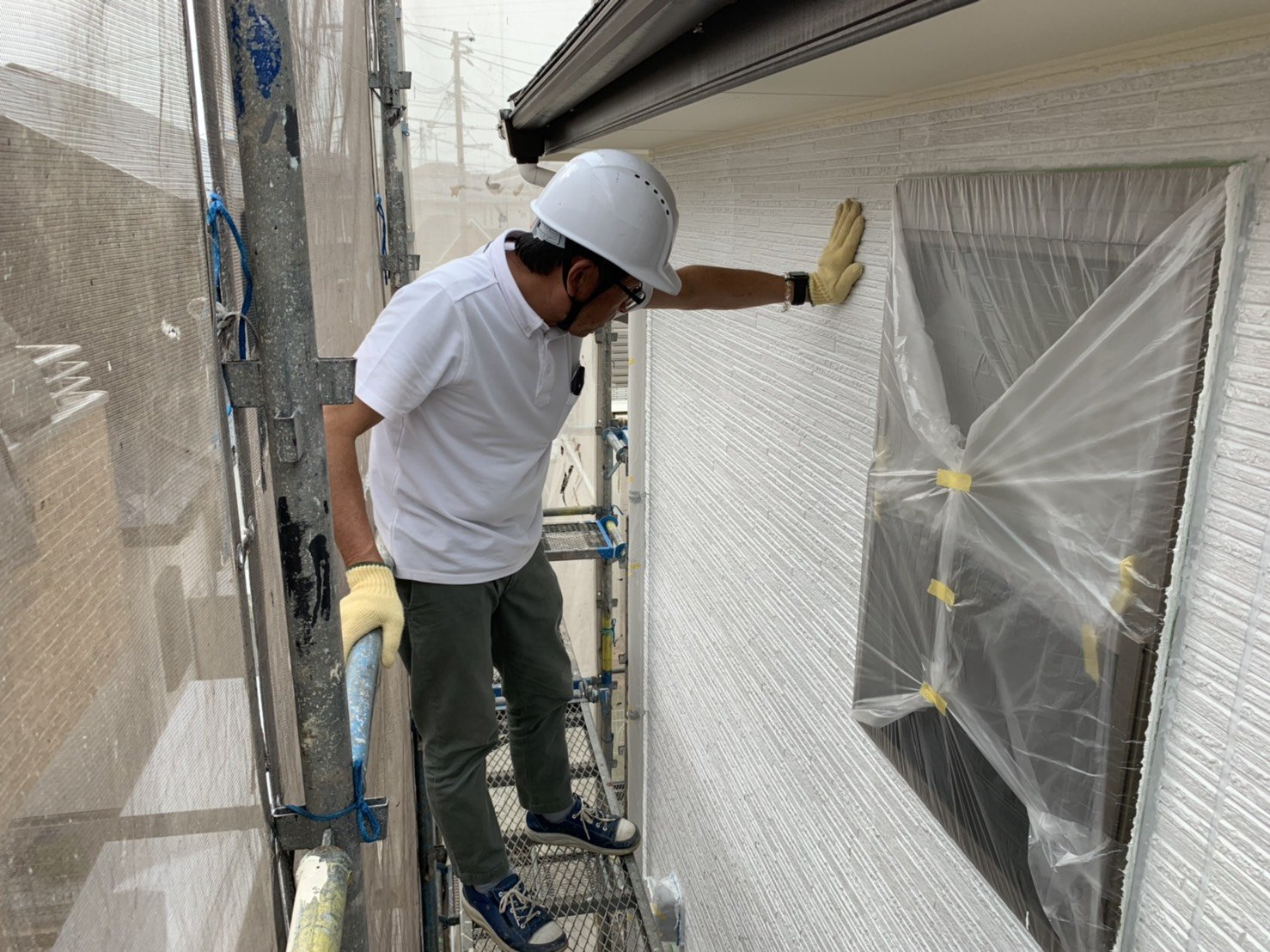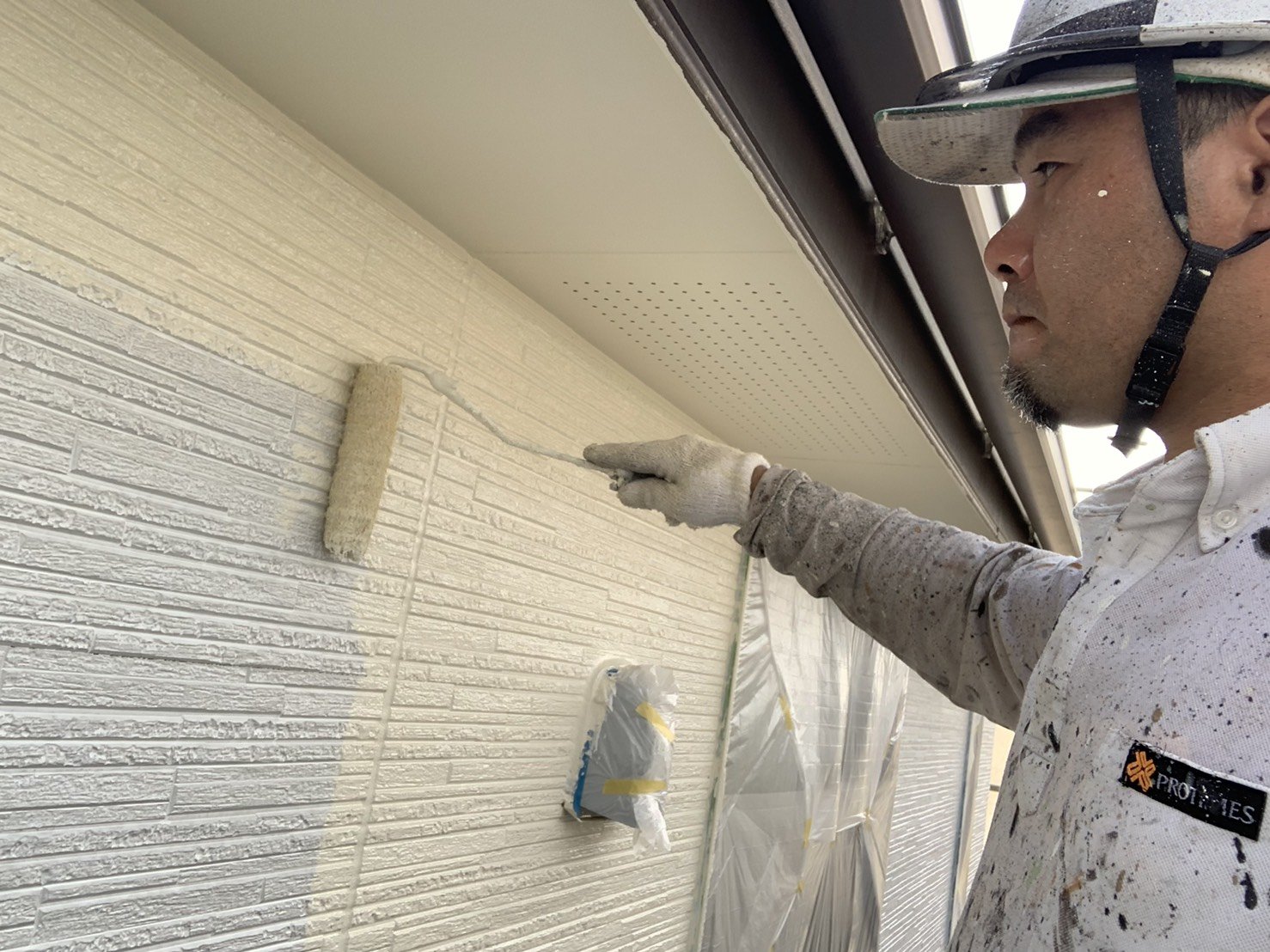 福岡県古賀市I様邸施工4日目屋根上塗り軒天塗装中間検査外壁中塗り作業