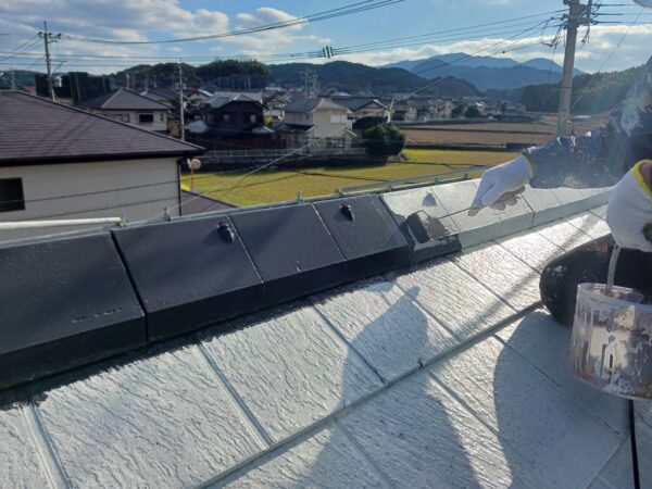 屋根中塗り作業は、縁取り作業です。