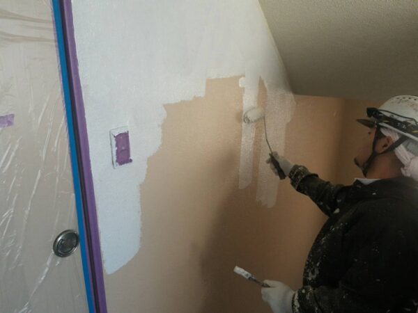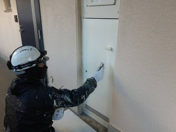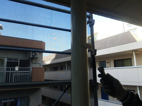Kマンション様施工21日目付帯塗装上塗り階段室壁下塗り装作業