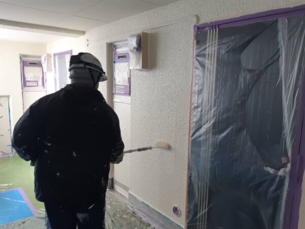 Kマンション様施工35日目共用通路壁上塗り塗装作業