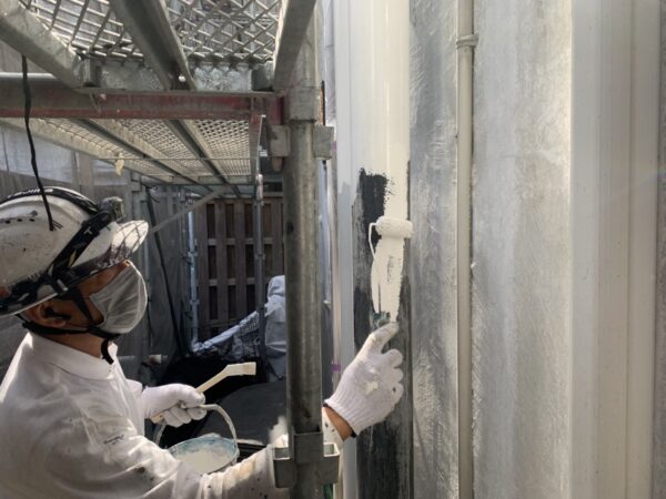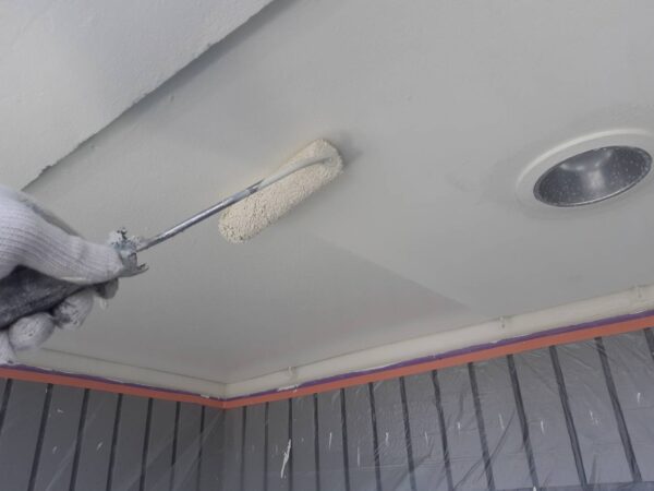 直方市須崎町S様邸施工5日目養生付帯中塗り軒天塗装作業