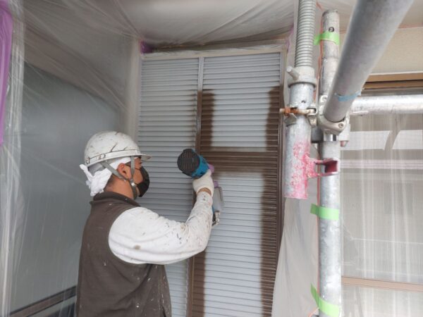 福岡県宗像市泉ヶ丘M様邸6日目軒天塗装屋根下塗り雨戸中塗り作業