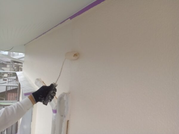 本日は、屋根·付帯上塗りと、塀塗装下塗り、中塗り作業です。
