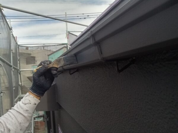 福岡県博多区東那珂I様邸施工8日目付帯上塗り雨戸両面上塗り作業