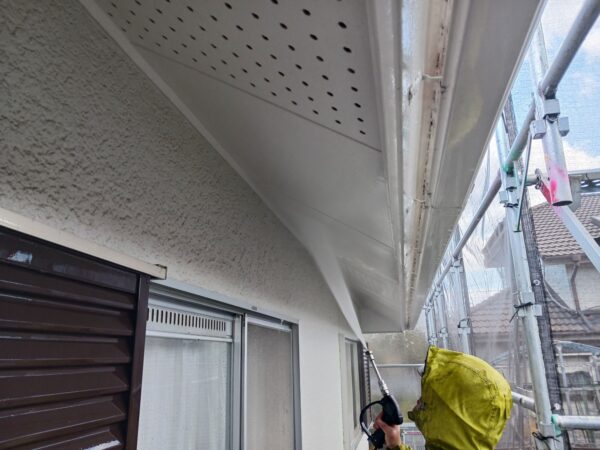 明日は、付帯塗装中塗り·軒天塗装を予定しています。