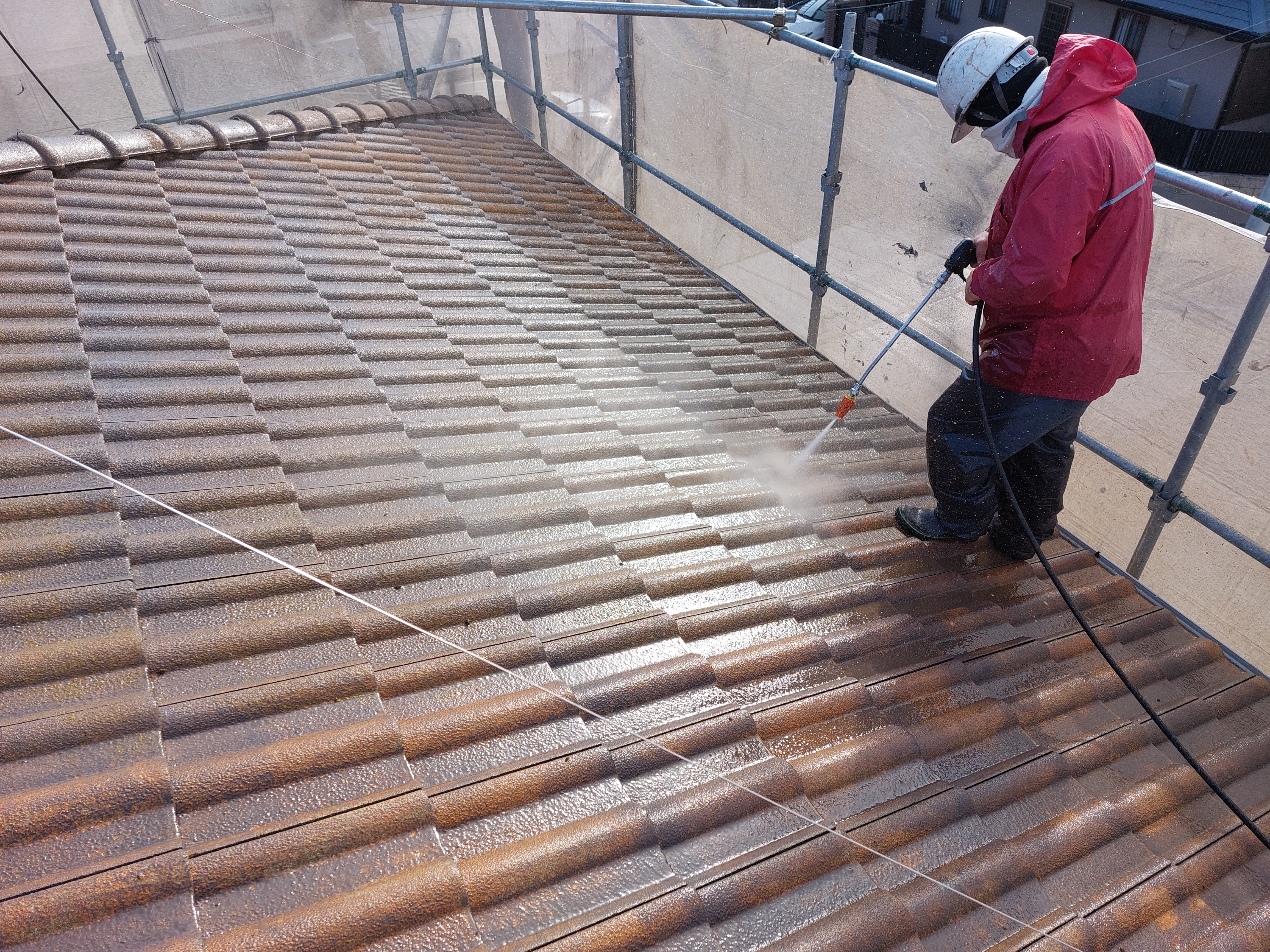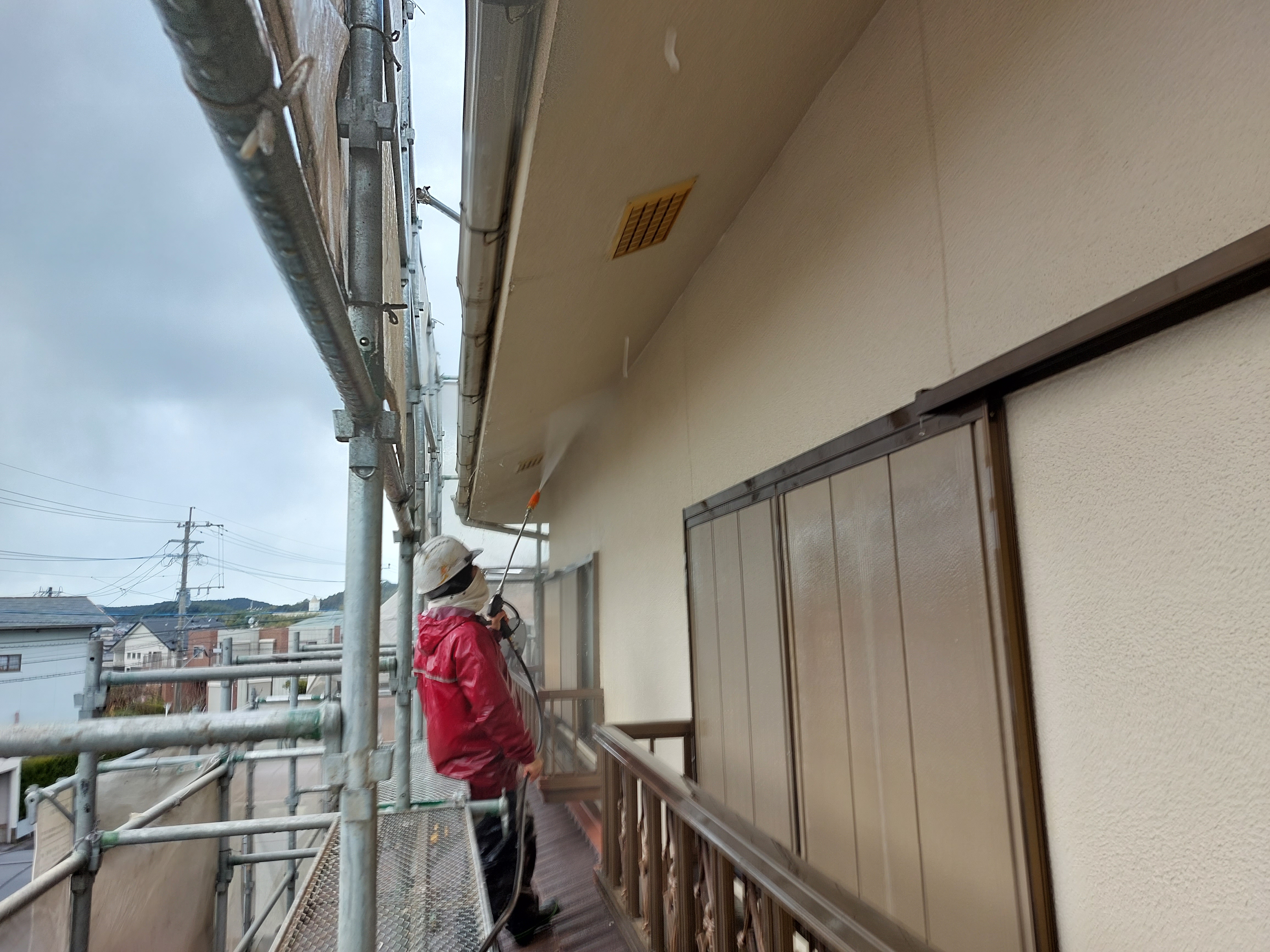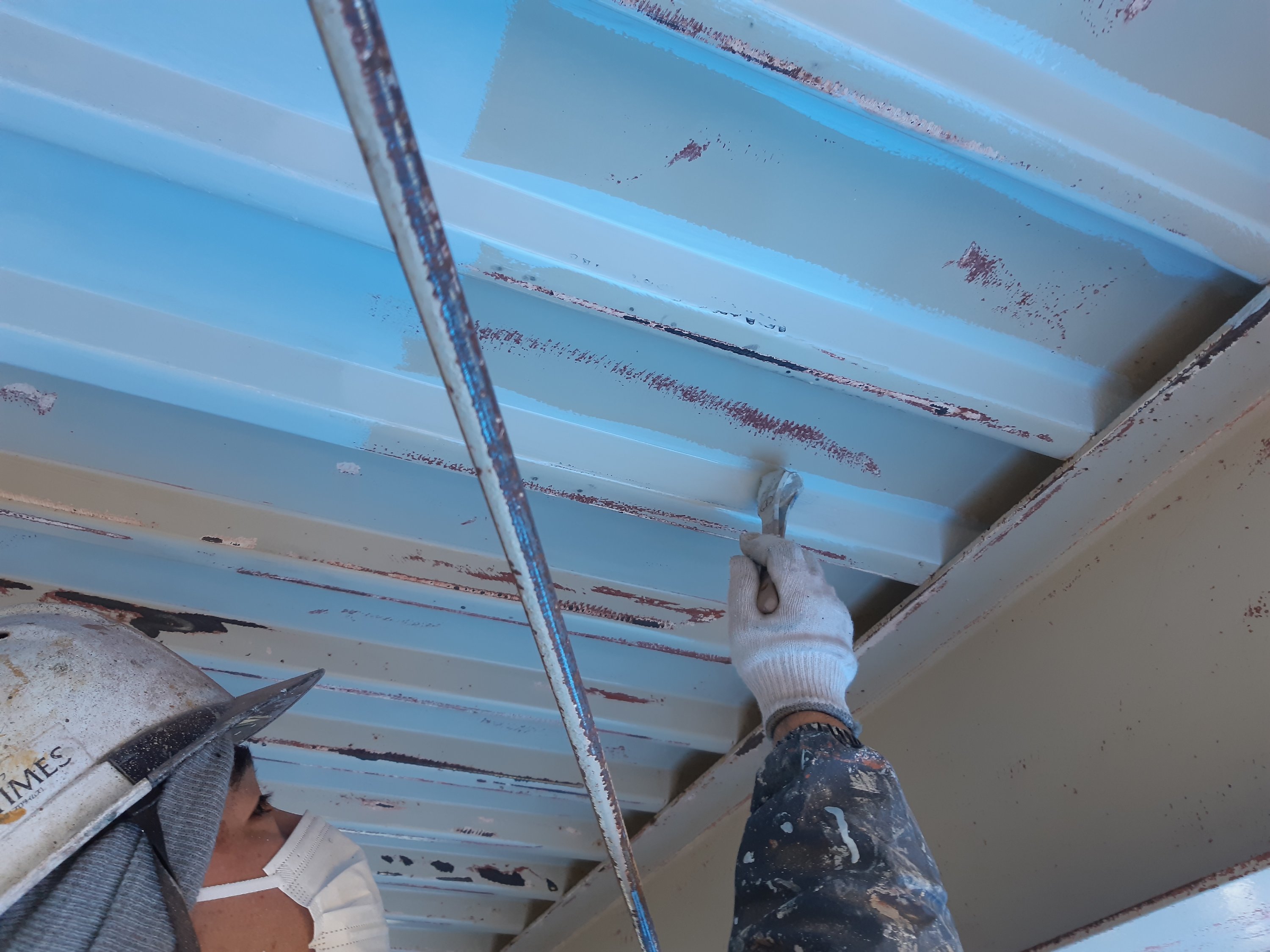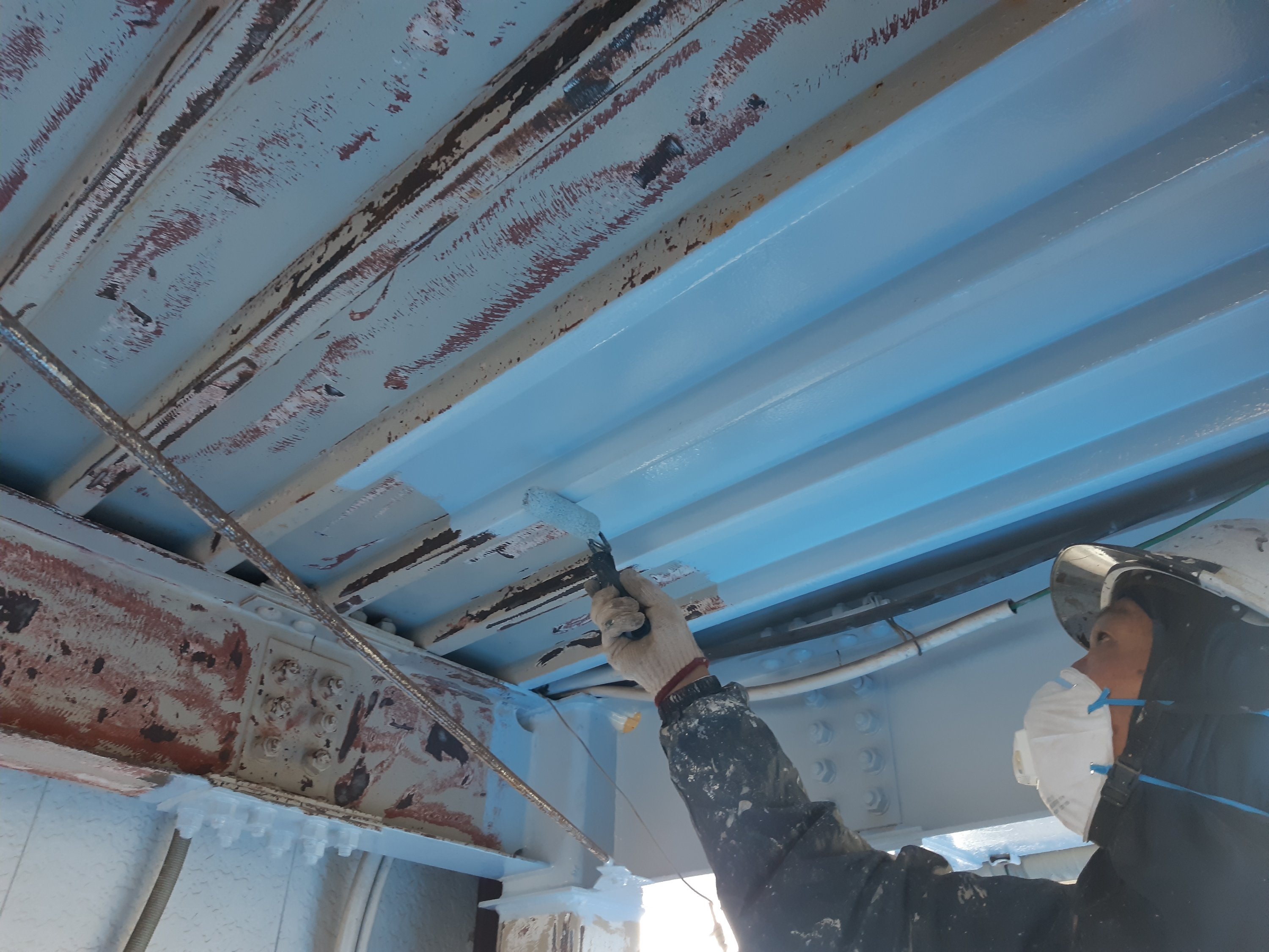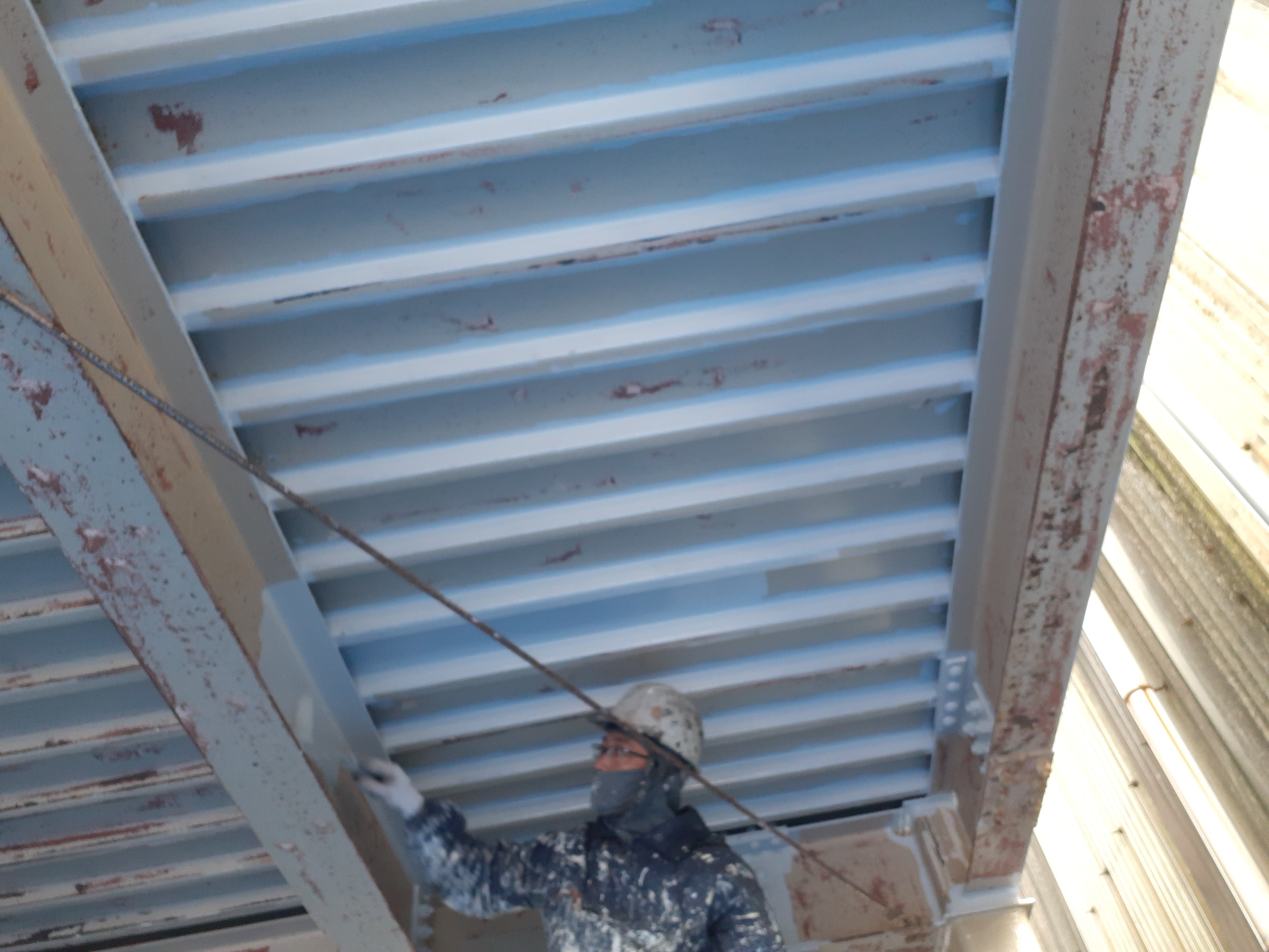 本日は、軒天塗装上塗りと、パラペット塗装中塗りを行いました。
