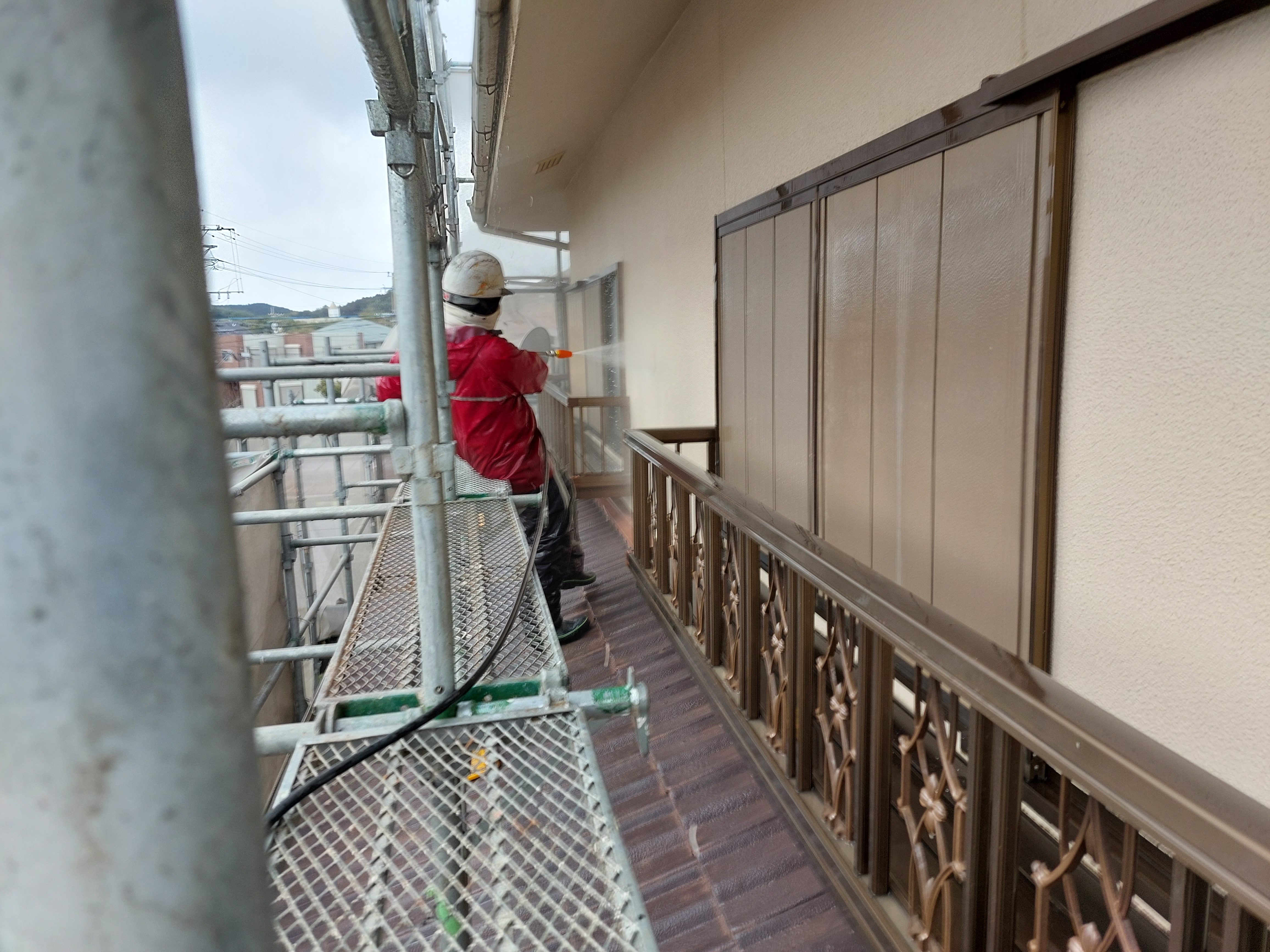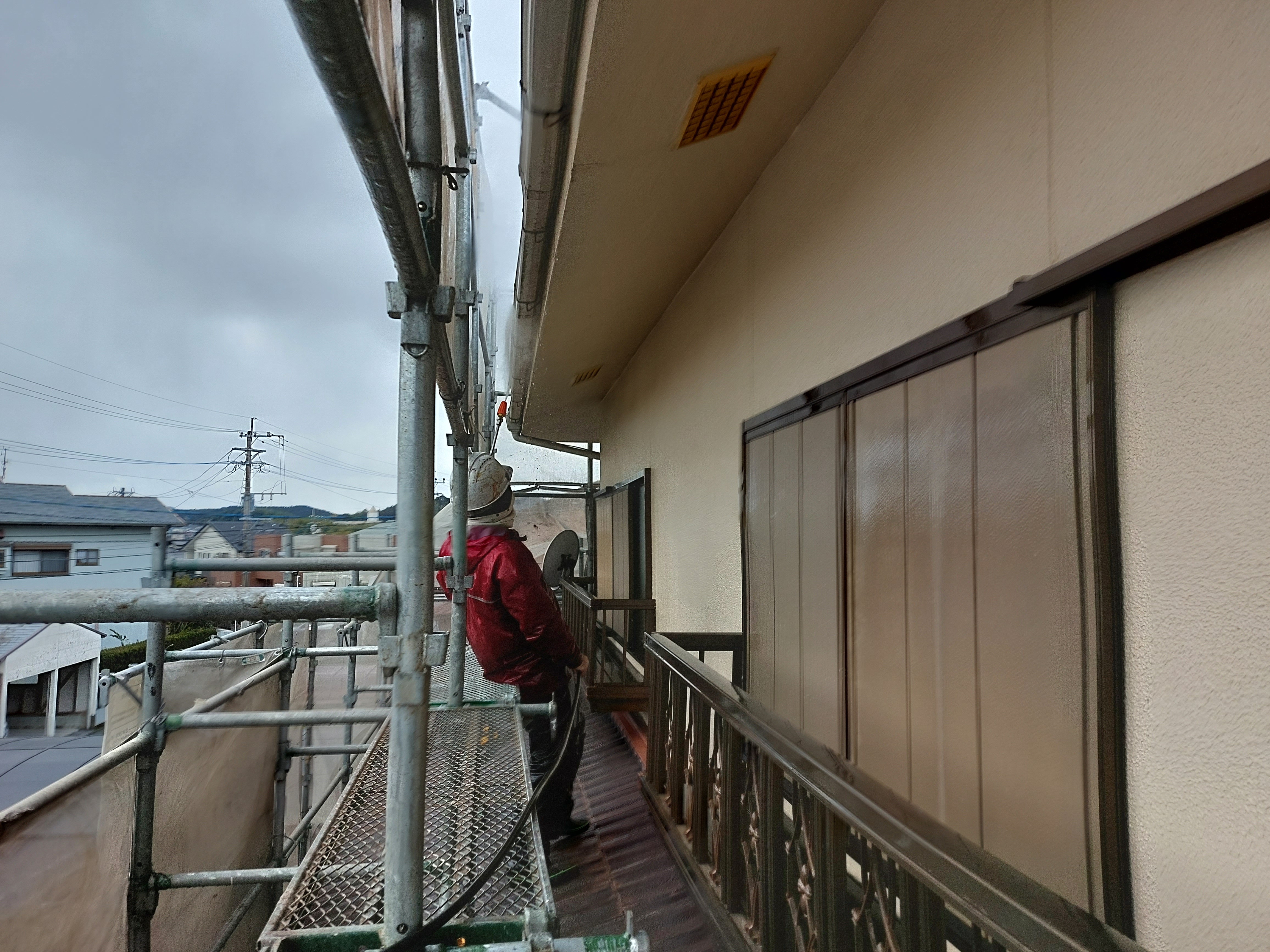 本日は、パラペット塗装上塗りと、外壁中塗り塗装を行いました。