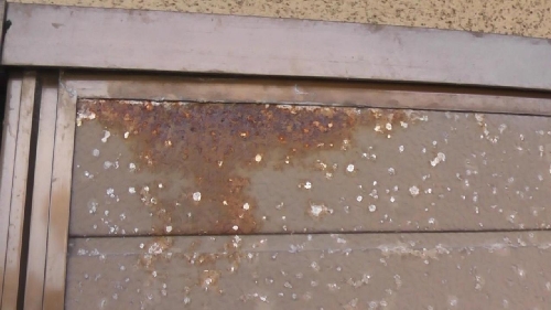 雨戸が変退色し、錆びが発生しています。ケレン・錆び止め後、塗装による塗膜保護が必要です。