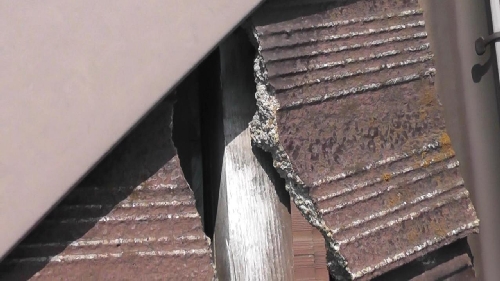 滑落しています。水の侵入による雨漏りの原因に繋がります。割れ部補修後、塗装による塗膜保護が必要です。