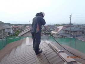 屋根洗浄 塗料が密着不良にならないよう、時間をかけてしっかり汚れを落とします