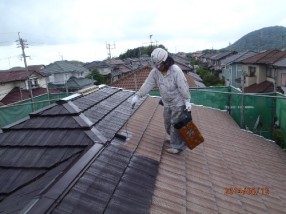 屋根下塗り 中塗り、上塗りの密着を良くする為、塗料の量を守り塗ります