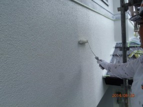 外壁下塗り 中塗り、上塗りの密着を良くする為、塗料の量を守り塗ります